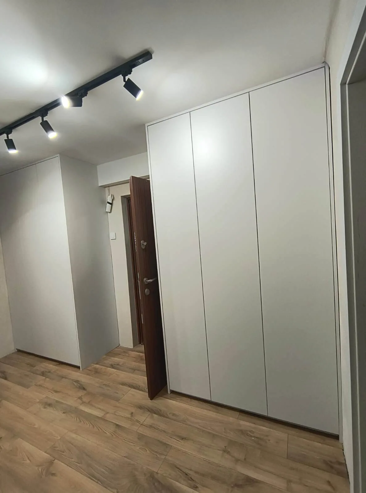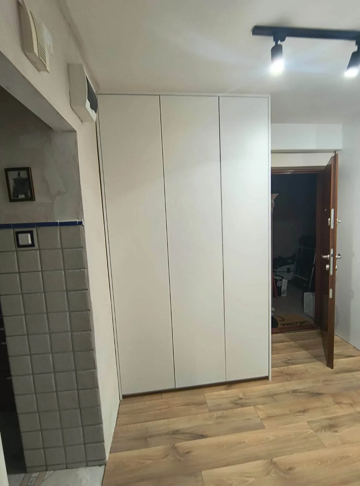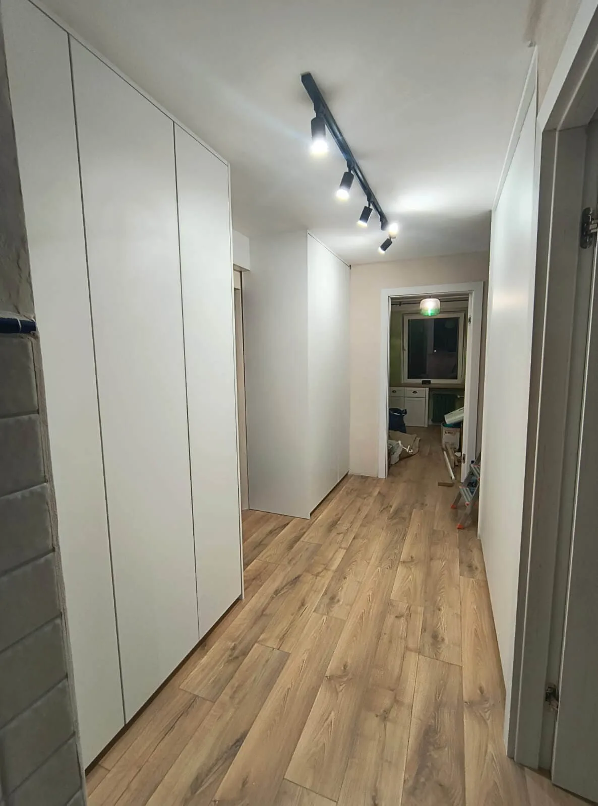 Zabudowa szaf w przedpokoju została wykonana w kolorze czystej bieli Egger W1100 ST9, co nadaje wnętrzu lekkości i elegancji. Gładkie fronty tworzą minimalistyczną, spójną płaszczyznę, dzięki której przestrzeń wygląda jaśniej i bardziej przestronnie. To rozwiązanie idealne do nowoczesnych mieszkań, w których liczy się funkcjonalność i estetyka w najlepszym wydaniu.