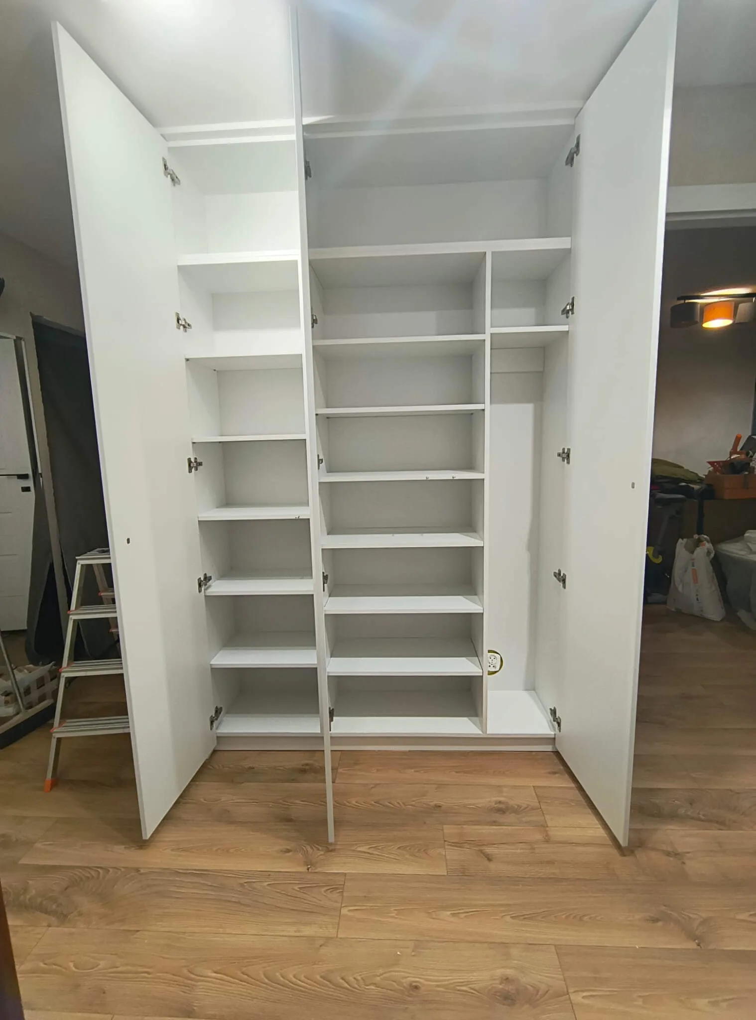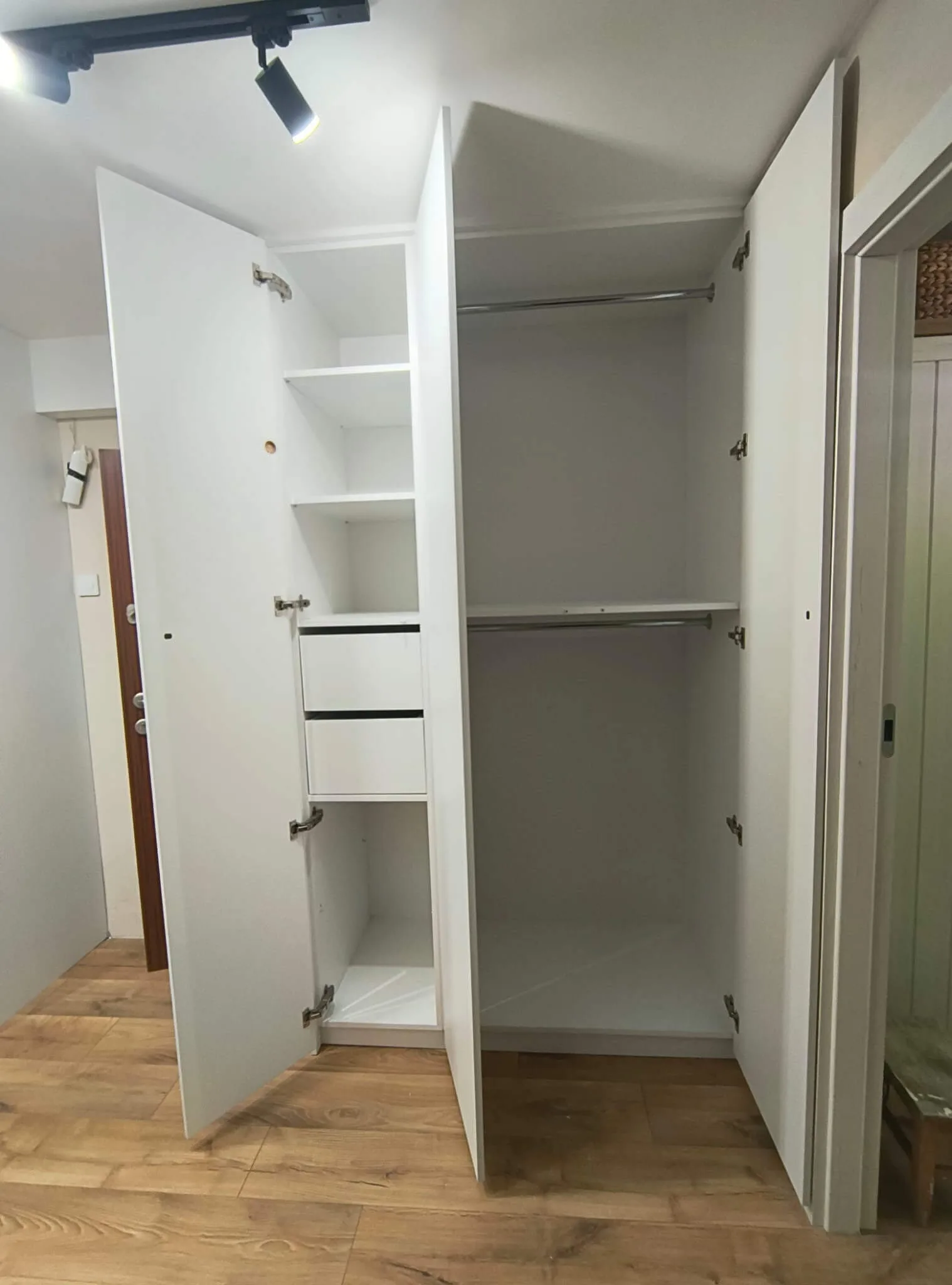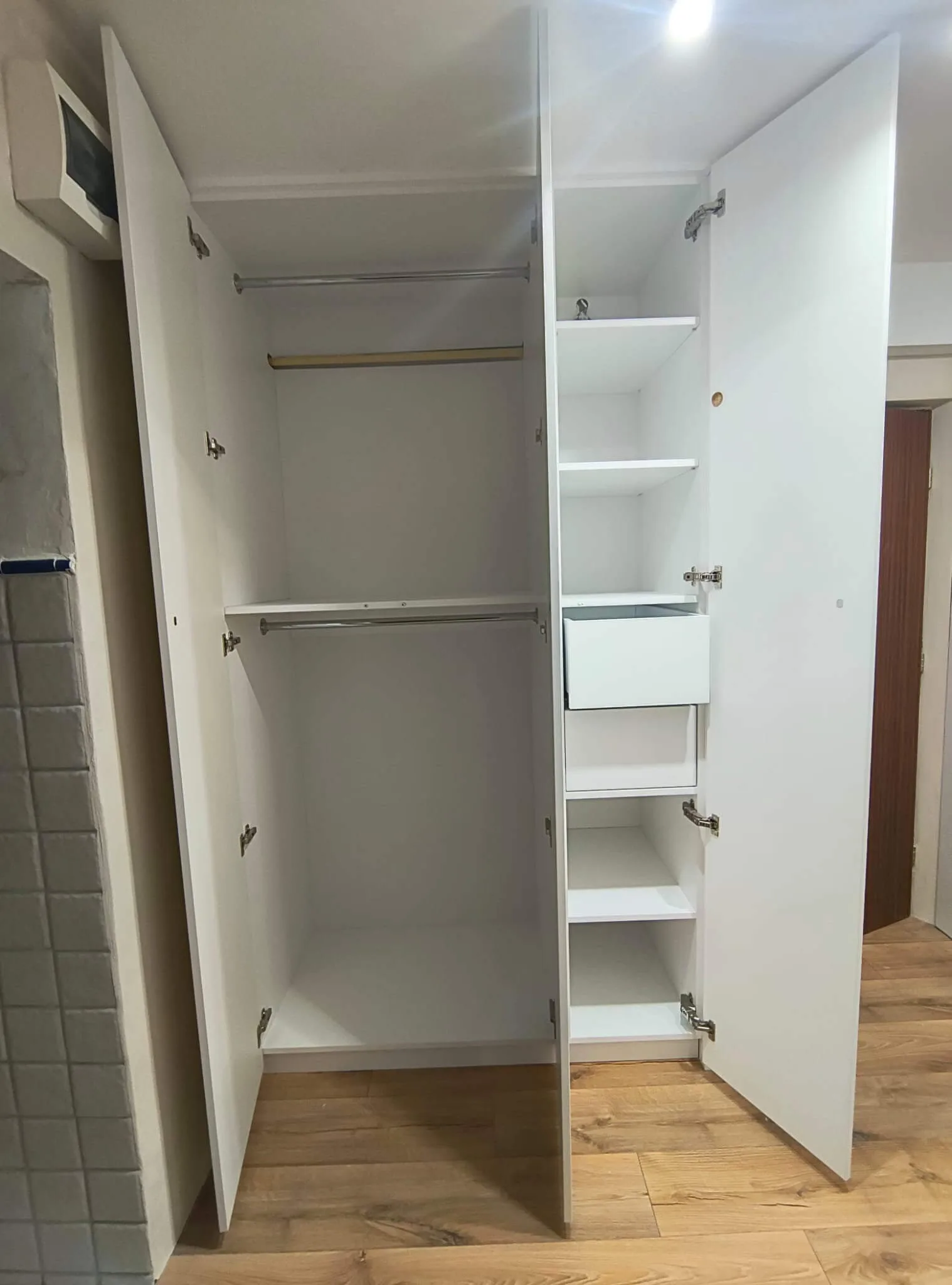 Zabudowa szaf w przedpokoju została wykonana w kolorze czystej bieli Egger W1100 ST9, co nadaje wnętrzu lekkości i elegancji. Gładkie fronty tworzą minimalistyczną, spójną płaszczyznę, dzięki której przestrzeń wygląda jaśniej i bardziej przestronnie. To rozwiązanie idealne do nowoczesnych mieszkań, w których liczy się funkcjonalność i estetyka w najlepszym wydaniu.