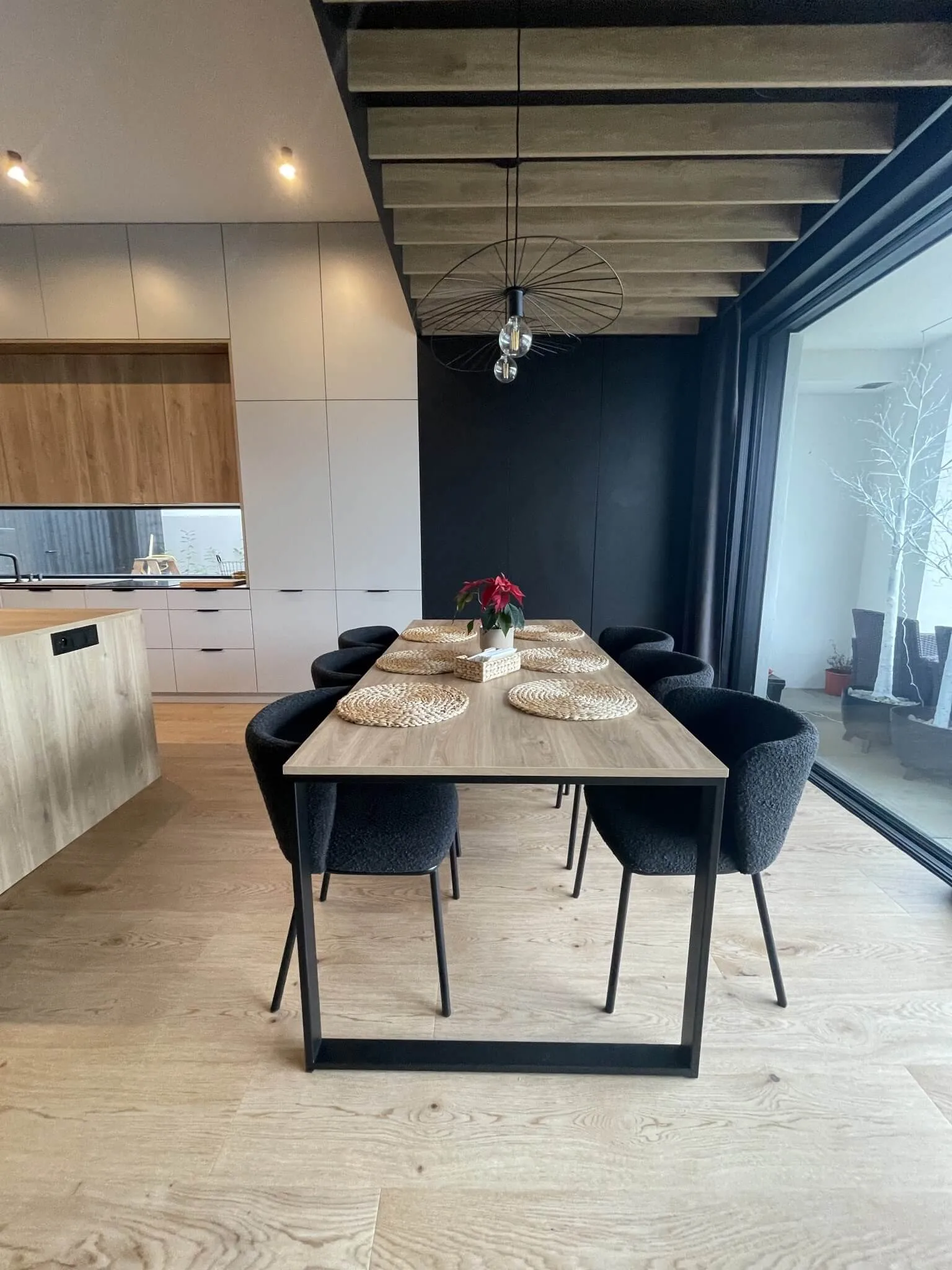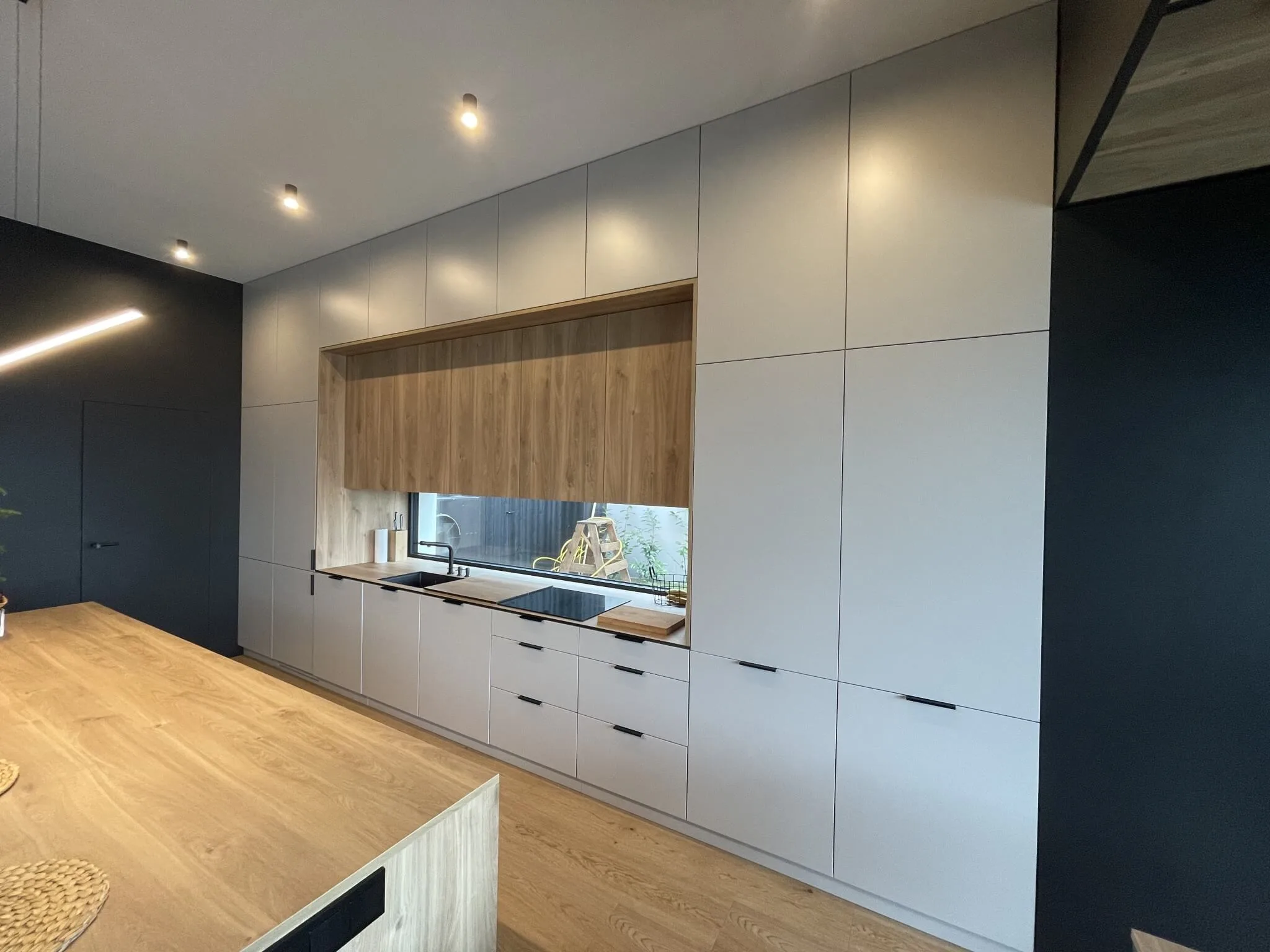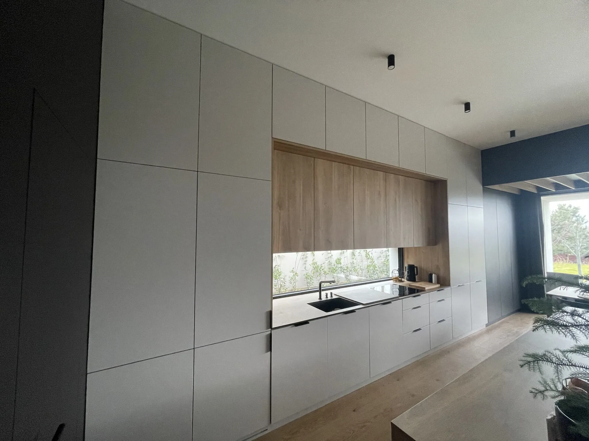Ten wyjątkowy dom marzeń to kompleksowa realizacja, która obejmuje nowoczesną kuchnię z imponującą wyspą, elegancką jadalnię, funkcjonalne garderoby, pojemne szafy oraz stylowe łazienki. Białe fronty mebli w połączeniu z blatami imitującymi naturalne drewno tworzą harmonijną i spójną estetykę, a czarne elementy dodają całości wyrazistości i nowoczesnego charakteru. To projekt, który łączy piękno, komfort i funkcjonalność, będąc doskonałym przykładem nowoczesnego designu dostosowanego do potrzeb wymagającego klienta.