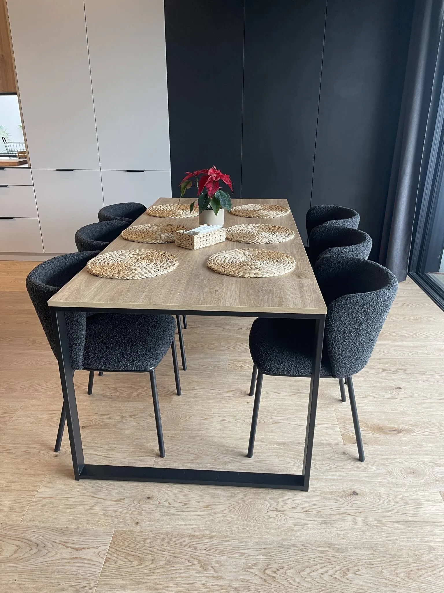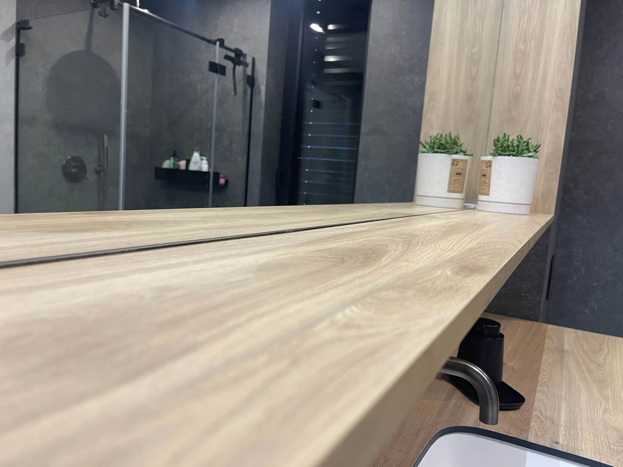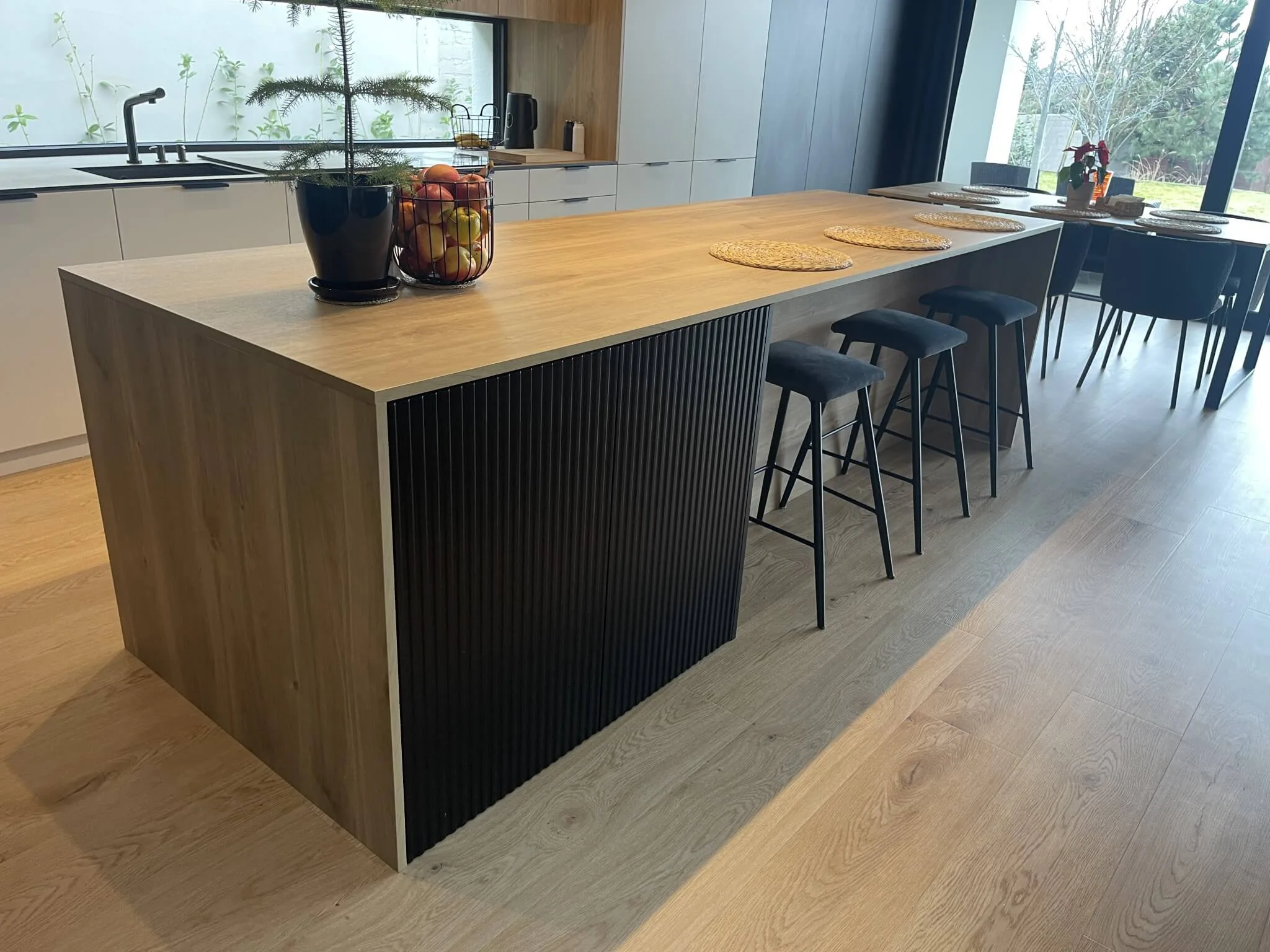 Ten wyjątkowy dom marzeń to kompleksowa realizacja, która obejmuje nowoczesną kuchnię z imponującą wyspą, elegancką jadalnię, funkcjonalne garderoby, pojemne szafy oraz stylowe łazienki. Białe fronty mebli w połączeniu z blatami imitującymi naturalne drewno tworzą harmonijną i spójną estetykę, a czarne elementy dodają całości wyrazistości i nowoczesnego charakteru. To projekt, który łączy piękno, komfort i funkcjonalność, będąc doskonałym przykładem nowoczesnego designu dostosowanego do potrzeb wymagającego klienta.