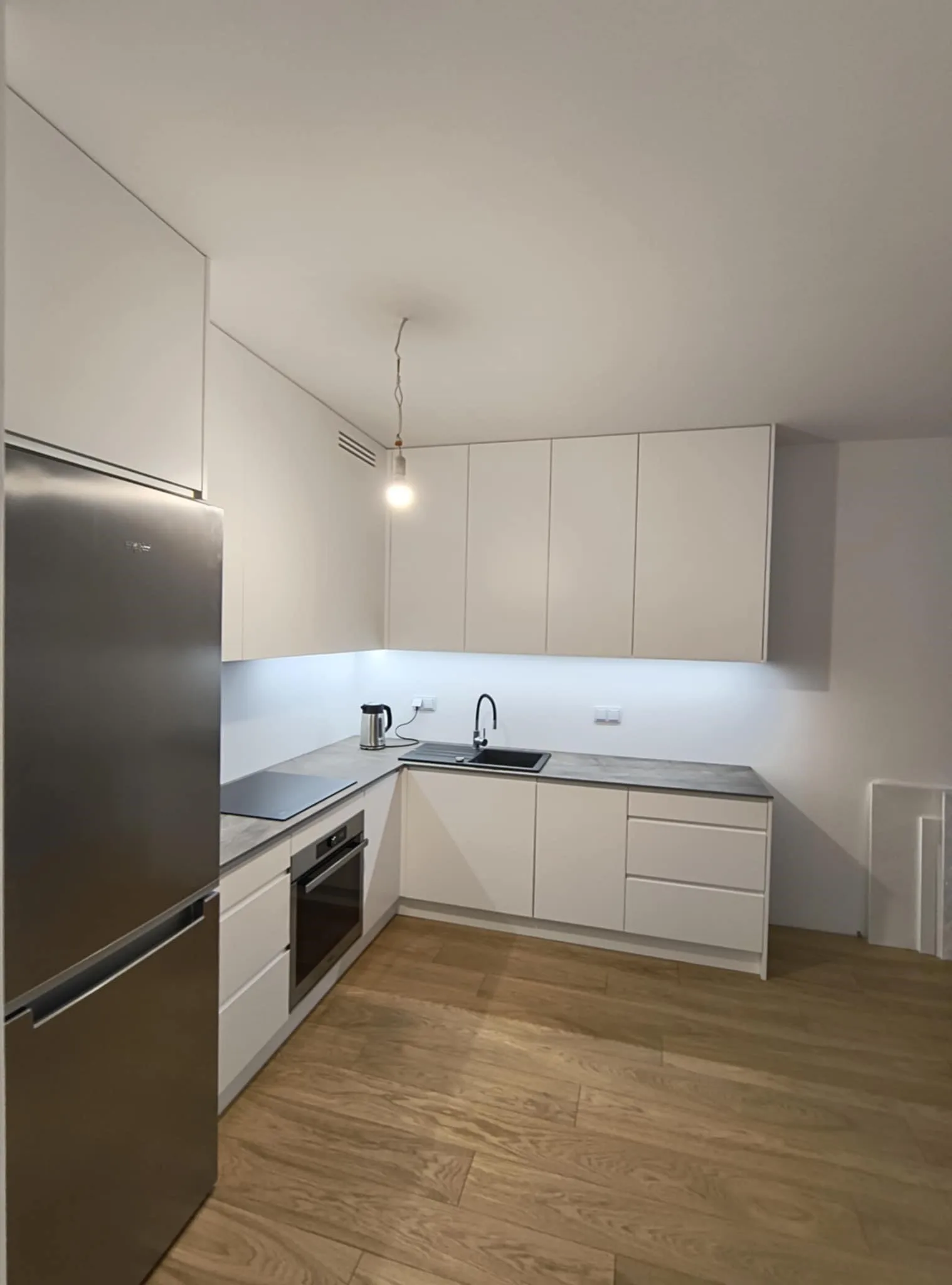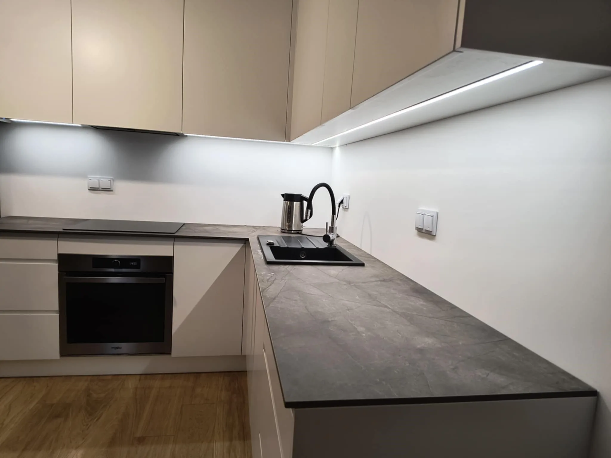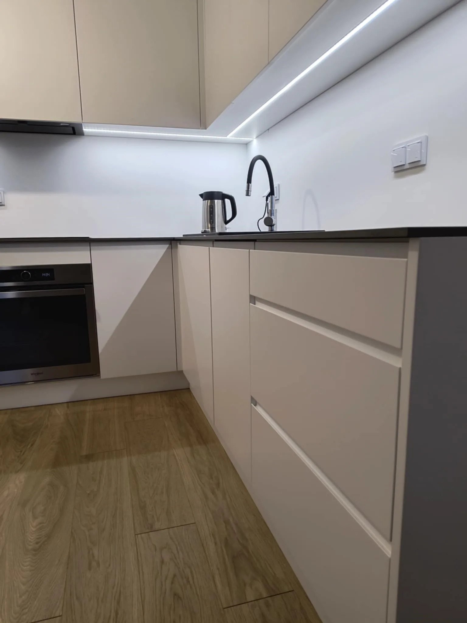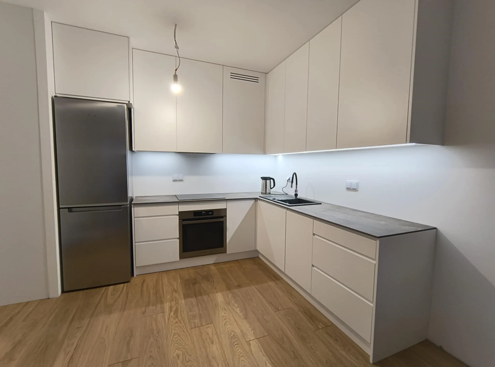 Ta kuchnia to połączenie prostoty i elegancji, gdzie białe, lakierowane fronty idealnie współgrają z nowoczesnym blatem wykonanym ze spieku, nadając przestrzeni minimalistyczny, ale wyrafinowany charakter. Gładkie powierzchnie i subtelne detale tworzą atmosferę spokoju, idealną do gotowania i relaksu. Dzięki swojej ponadczasowej estetyce kuchnia ta będzie wciąż zachwycać przez lata, będąc funkcjonalnym sercem domu.