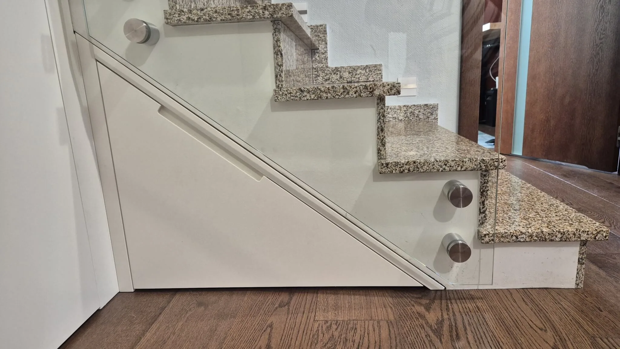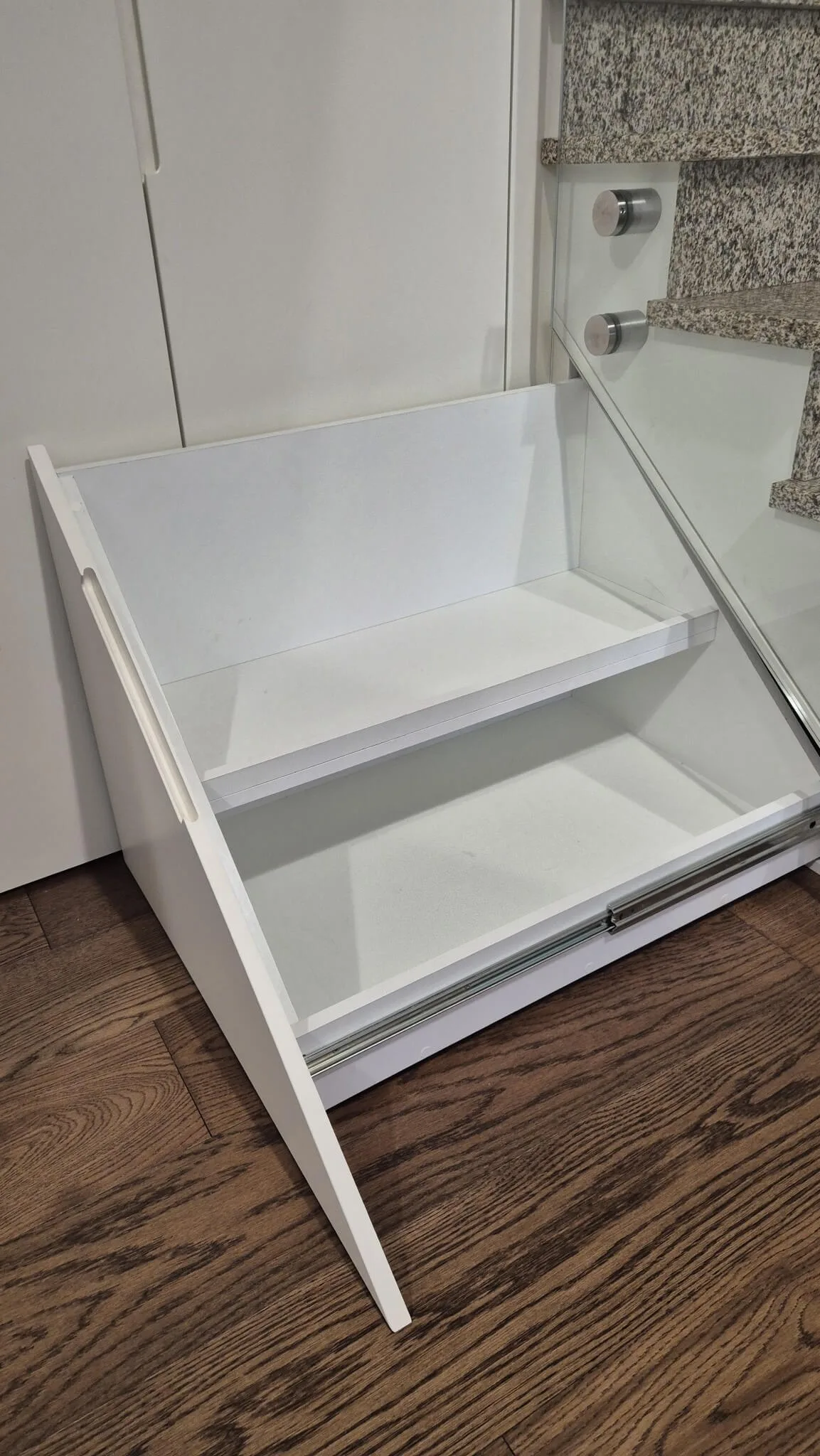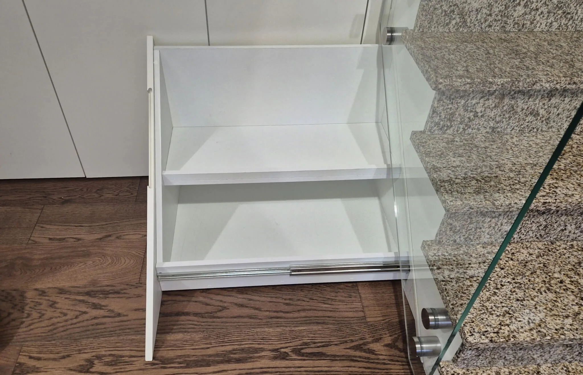 Funkcjonalna szuflada pod schodami, która dzięki pełnemu wysuwowi i imponującej nośności do 120 kg, pozwala maksymalnie wykorzystać trudną przestrzeń. Lakierowany na biało front doskonale wpisuje się w nowoczesną estetykę, a precyzyjne dopasowanie i solidne wykonanie podkreślają dbałość o każdy szczegół. To praktyczne rozwiązanie, które łączy elegancję z niezawodnością, idealne do przechowywania w nietypowych miejscach.